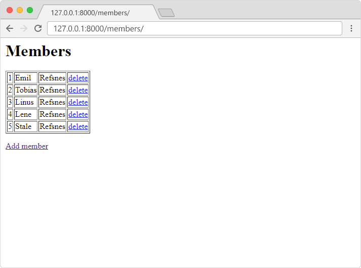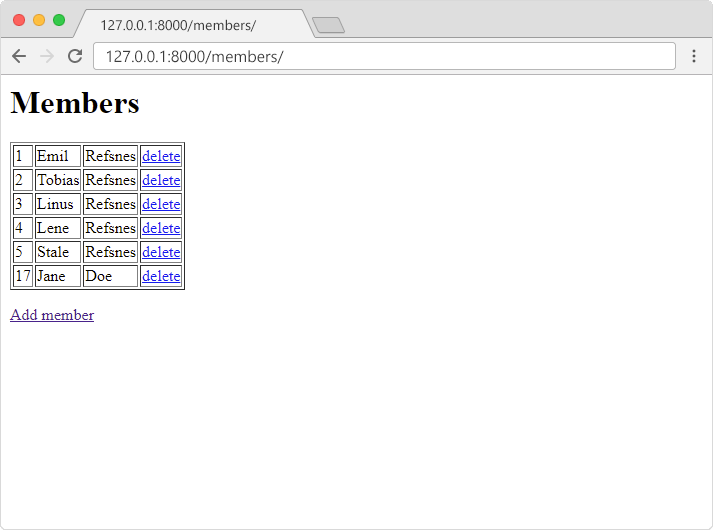 The "delete" link in the HTML table points to 127.0.0.1:8000/members/delete/