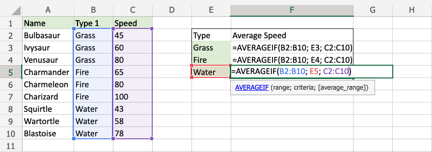 The function now calculates the average speed value of the Grass type Pokemon: Bulbasaur, Ivysaur and Venusaur.