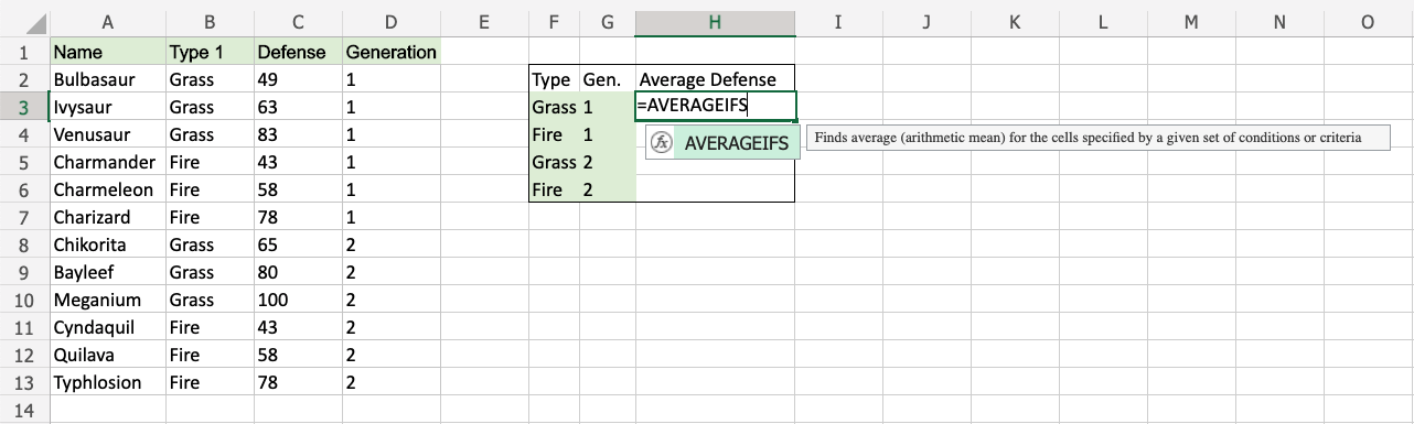 The function now calculates the average defense value of the 1st Generation Grass type Pokemon: Bulbasaur, Ivysaur and Venusaur.