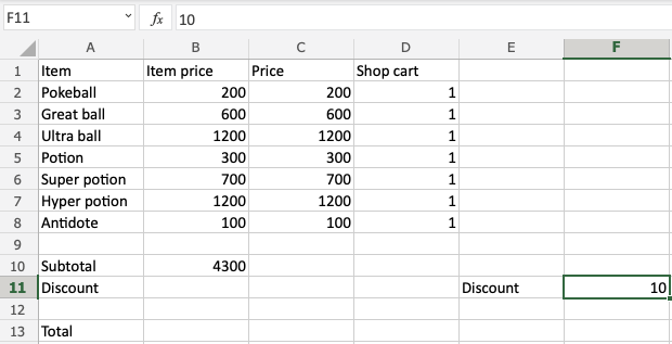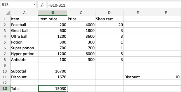 In this case we help the Poke Mart merchant to create a shop cart overview with prices, discount and total price. You will practice the skills that you have learned in the earlier chapters.