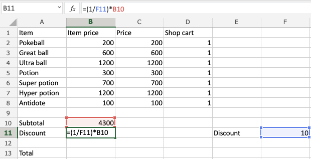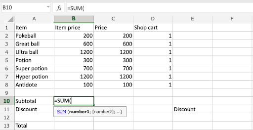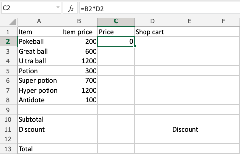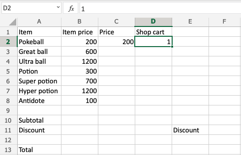 Start by creating the first formula for Item price*Shop cart. We want the price to change when we change items in the Shop cart. Use the fill function on the range D2:D8 afterwards to save time.
