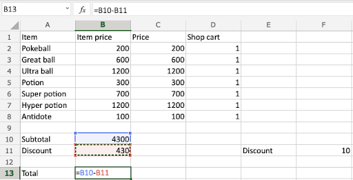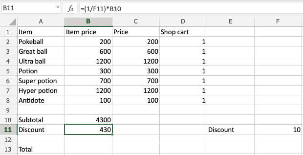 The discount is calculated by usingF11(10)into the formula inB11 -