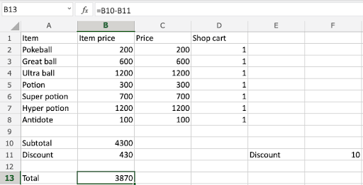 Subtract the discount B11 from the subtotal B10 to calculate the total.