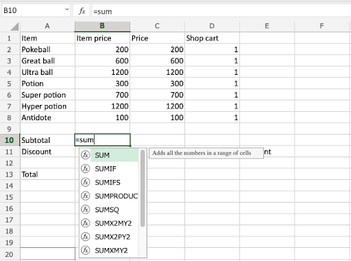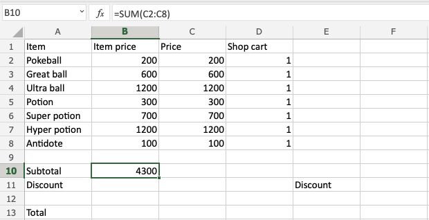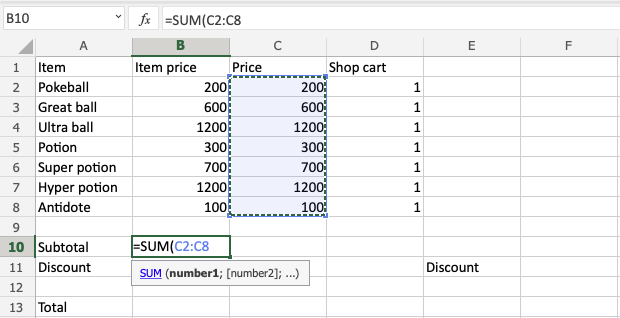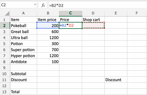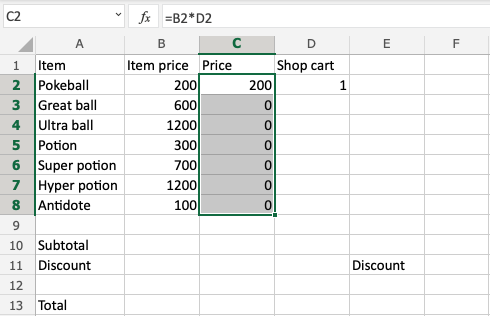 RangeC2:D8calculates the prices by multiplying item price and shop cart -