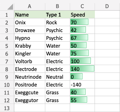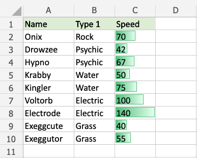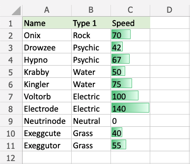 Now, all of the Speed value cells have a green bar showing how big the value is compared to the other values in the range: