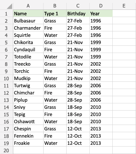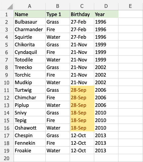 Turtwig, Chimchar, Piplup, Snivy, Tepig, and Oshawott all have birthdays in September, so their cells are hightlighted.