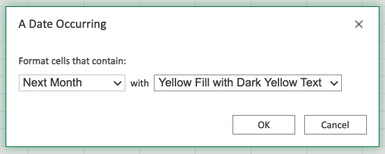 The "A Date Occurring..." Highlight Cell Rule will highlight a cell with one of the appearance options based on the cell value relative to a specified time frame.