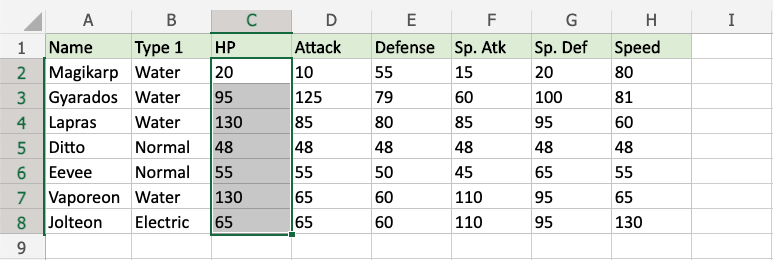 Now, the cells with text values later in the alphabet than "Gyarados" will be highlighted in yellow: