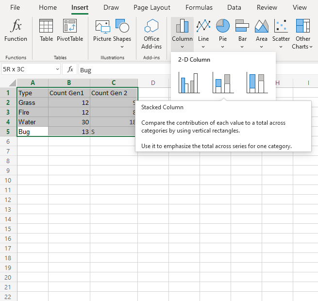 The chart gives a visual overview for the total number of "Grass", "Fire", "Water" and "Bug" type Pokemons in both generation 1 and 2.
