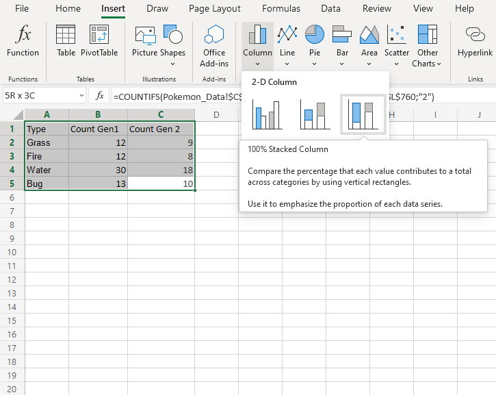 100% Stacked Column is used to highlights the proportion of contribution for each data column in a category.