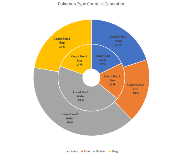 This doughnut chart shows the ratio of different Pokemon types in generations 1 and 2.