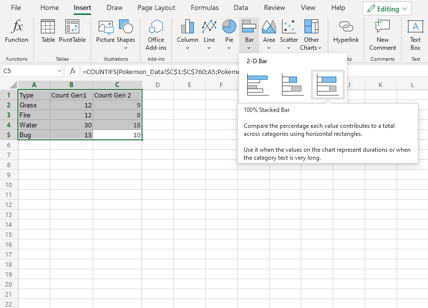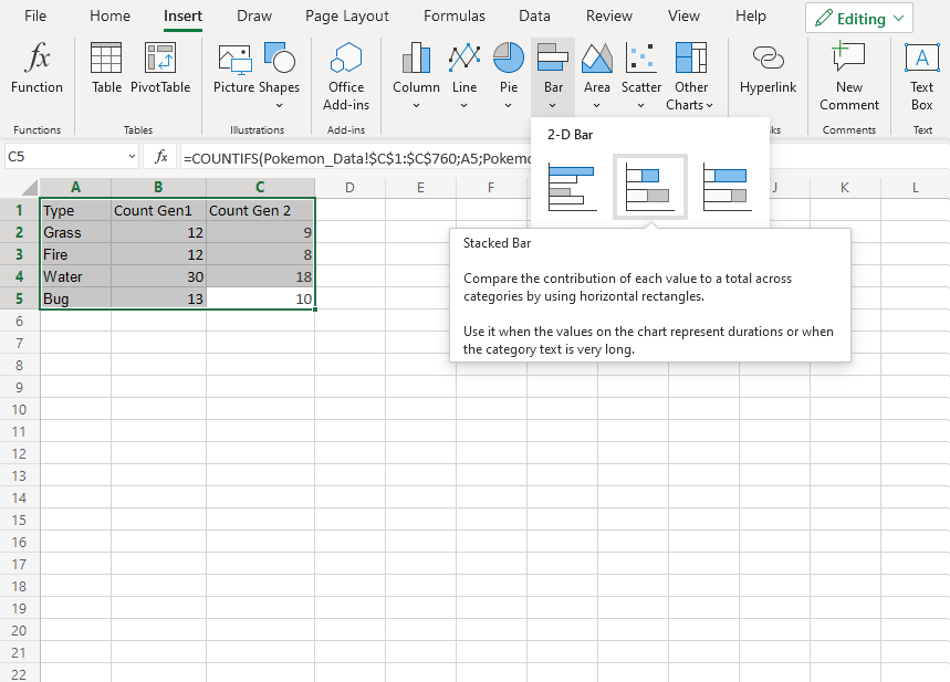 The chart gives a visual overview for the total number of "Grass", "Fire", "Water" and "Bug" type Pokemons in both generation 1 and 2.