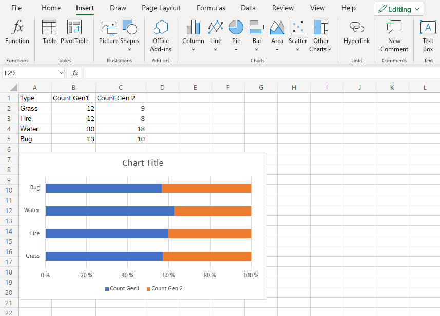 The chart gives a visual overview for the proportion of "Grass", "Fire", "Water" and "Bug" type Pokemons in both generation 1 and 2.