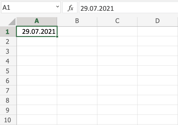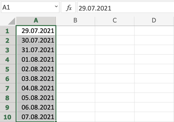 The fill function has filled 10 days from A1(29.07.2021) to A10(07.08.2021).