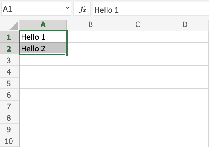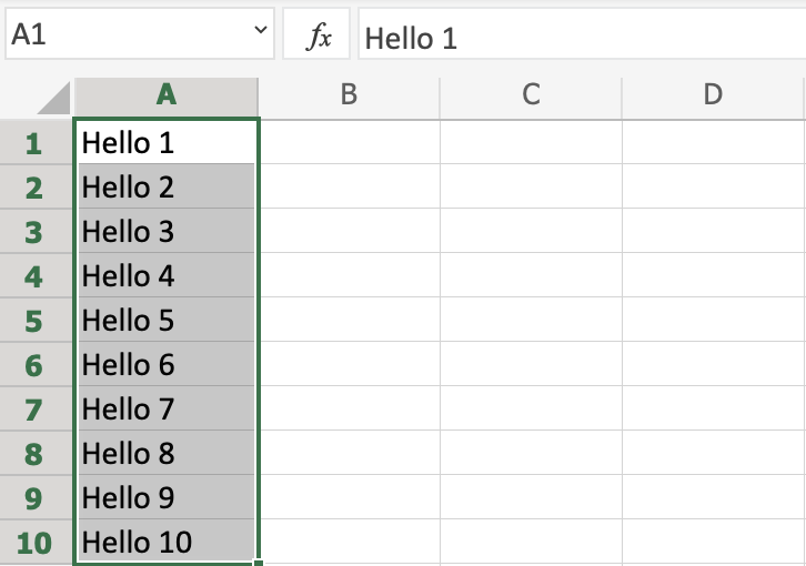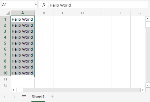 Filling the range A1:A10 creates ten copies of "Hello World":