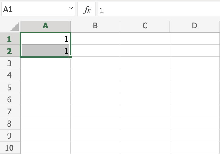 Lets type the value (1) into the cell A2, which is what we have in A1. Now we have the same values in both A1 and A2.