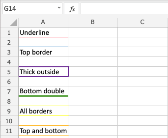 Borders can be added with different colors and styles. The border button remembers the border settings used the last time. The options are accessed from the border options button, next to the border button.