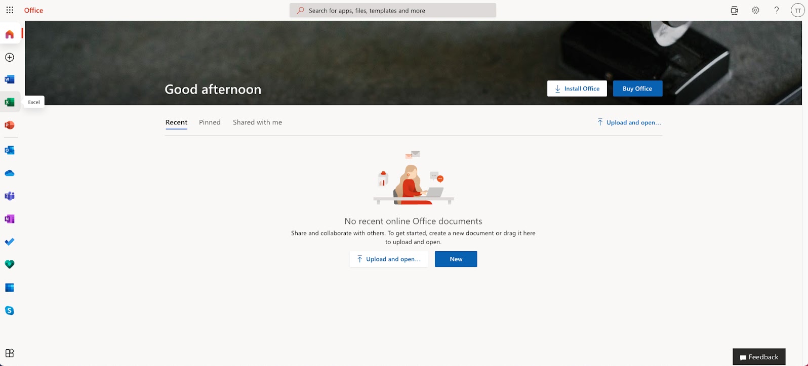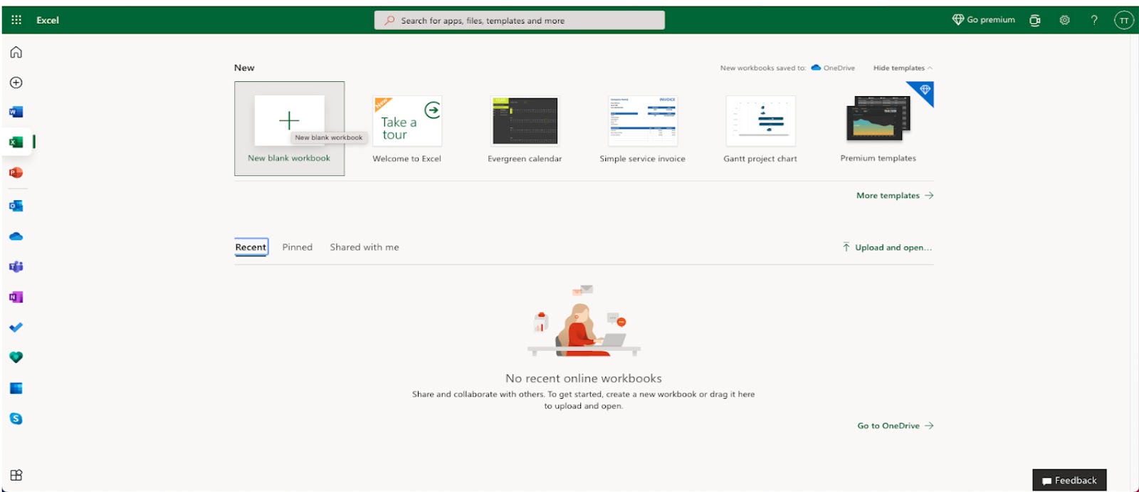 Once you have successfully logged into Office through www.office.com, click on the Excel icon on the left side to enter the application: