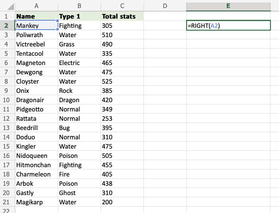 =RIGHT(A2) uses the default funcion of RIGHT and retrieves the last symbol from the A2 cell.