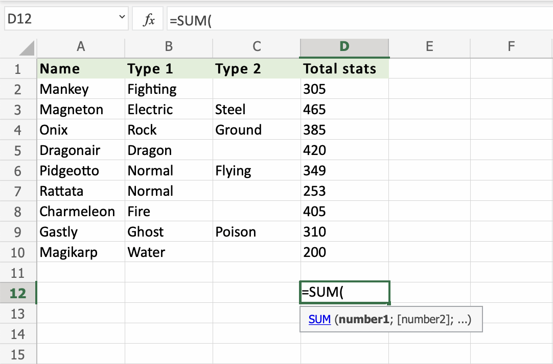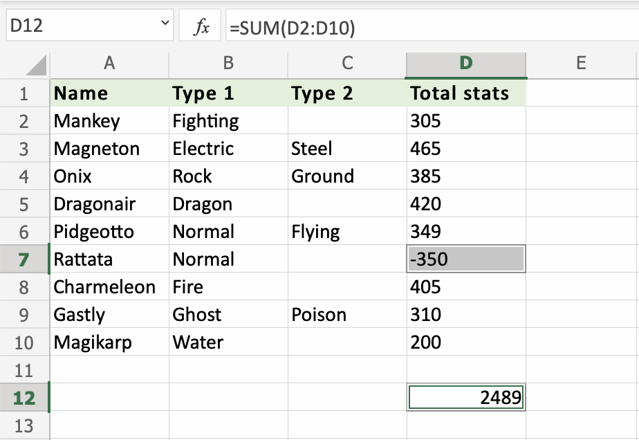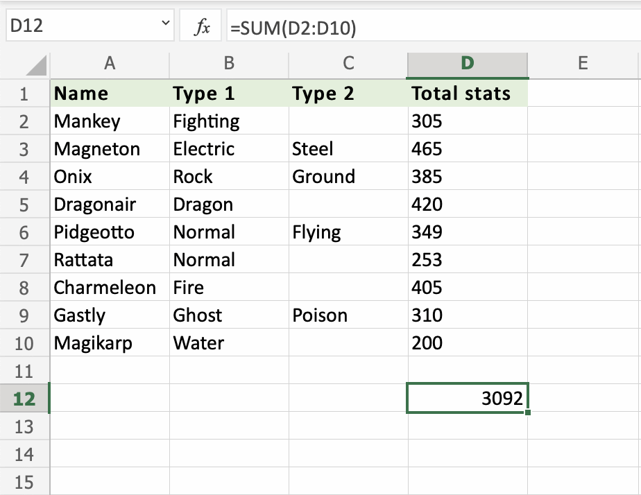 Great job! You have successfully calculated the sum of the stats using the =SUM function. The Pokemon's stats have a total sum of 3092.