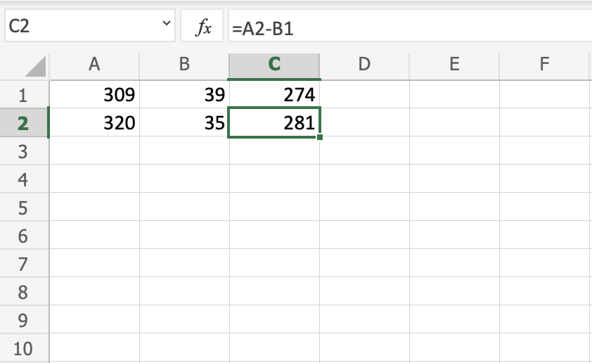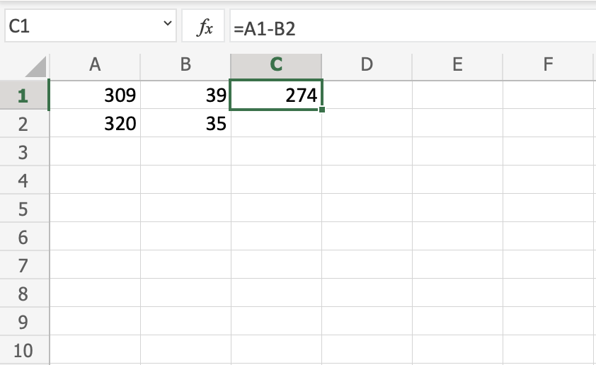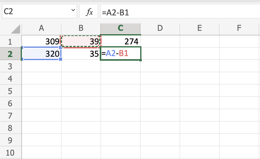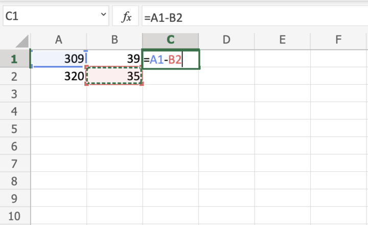 Tip: The formula can be typed directly without clicking the cells. The typed formula would be the same as the value in C1 (=A1-B2).