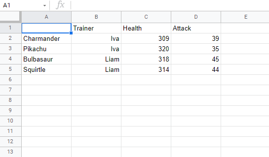 Next, we need to get some Pokemon trainers in there. Type or copy the following data in the new column B: