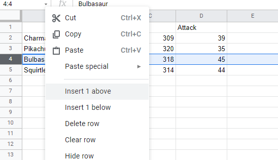 We forgot to add Iva's Pokemon, Marowak. Lets add Marowak's data to the new row 4, by typing or copying the following values: