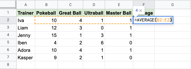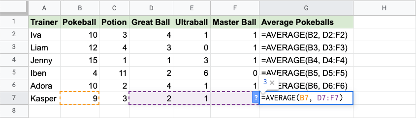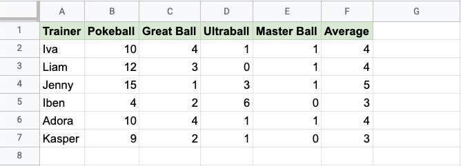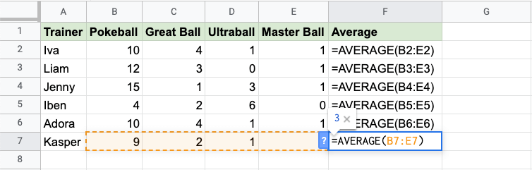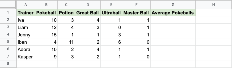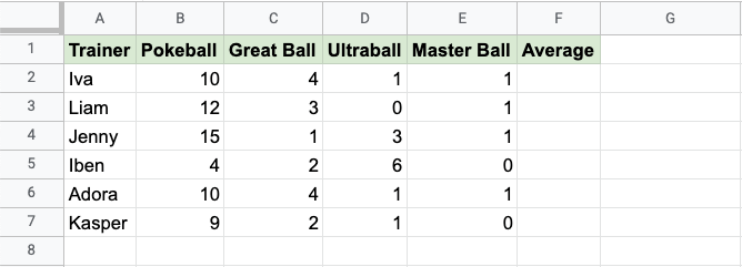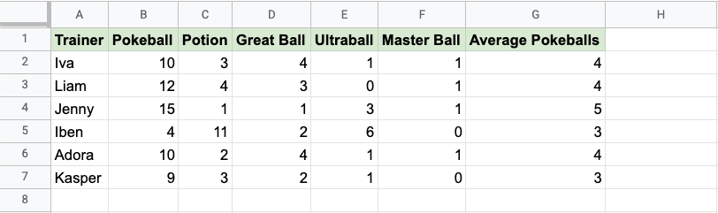 The function can be repeated with the filling function for each row to calculate the average number of Pokeballs for all the Trainers:
