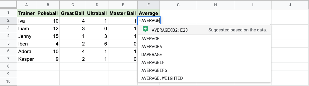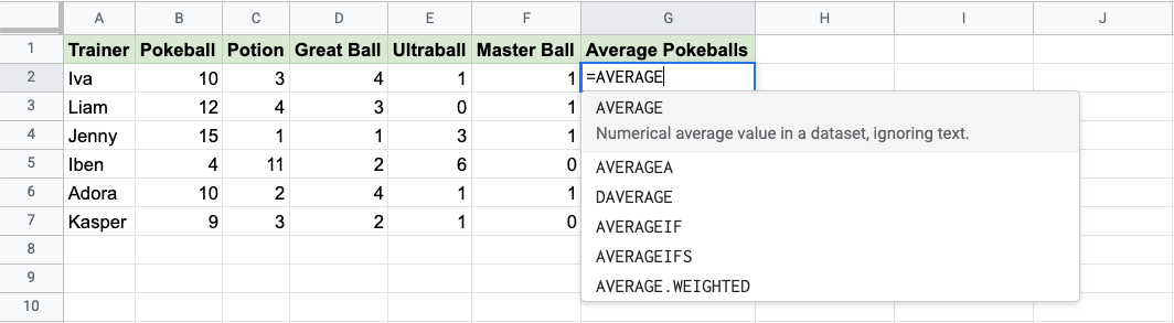 The AVERAGE function is a premade function in Google Sheets, which calculates the average (arithmetic mean).