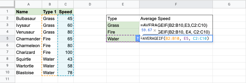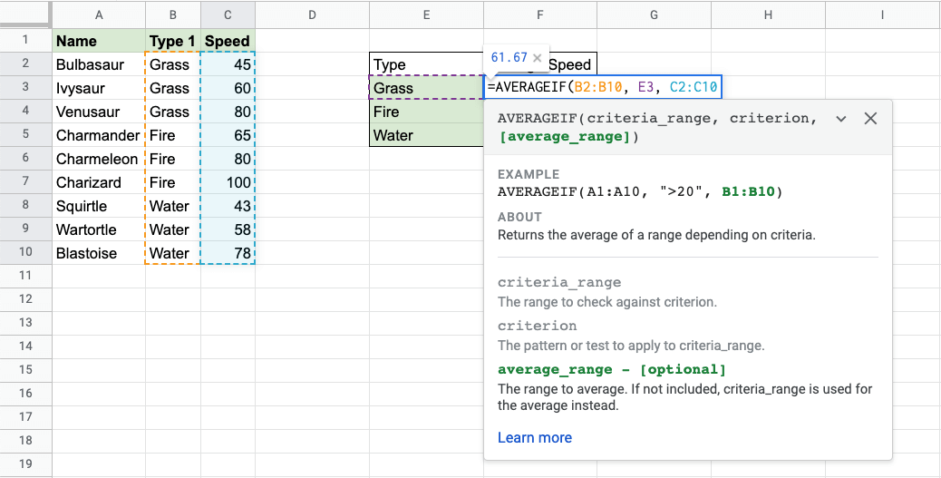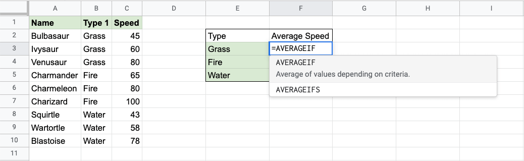The function now calculates the average speed value of the Grass type Pokemon: Bulbasaur, Ivysaur and Venusaur.