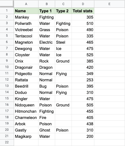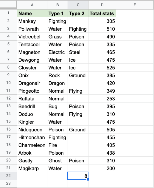 Apply the =COUNTBLANK function to range C2:C21, to find the Pokemons which do not have a 2nd Type:
