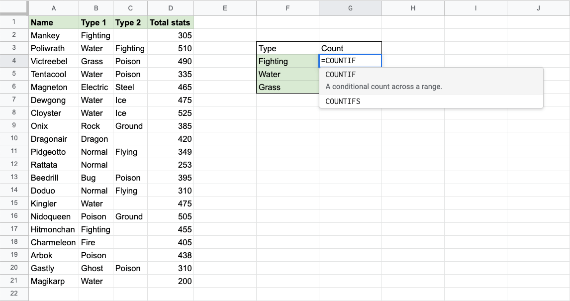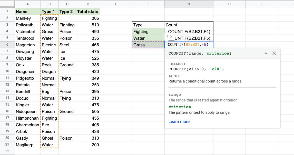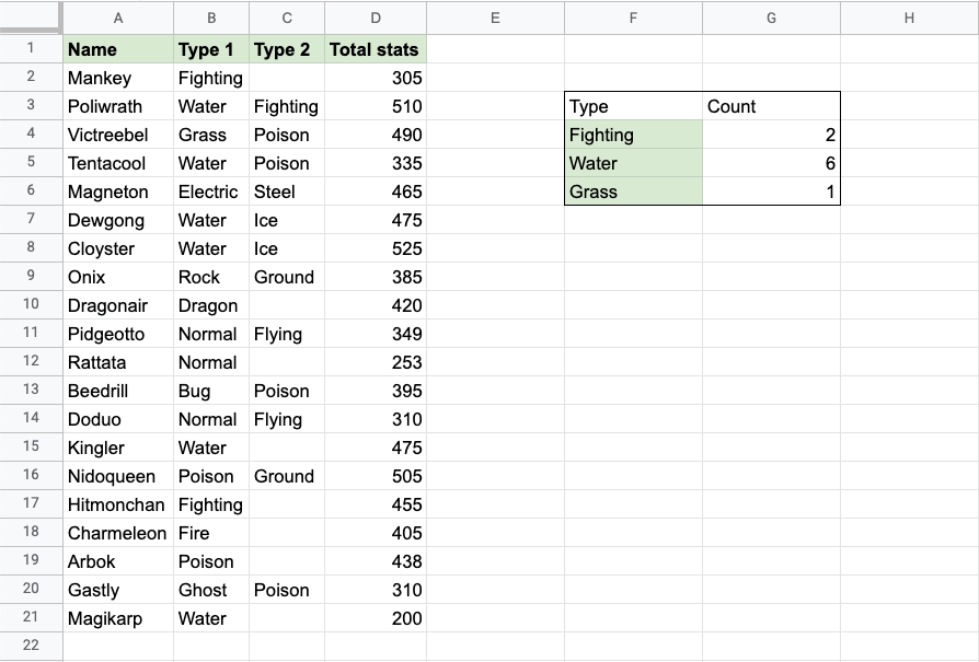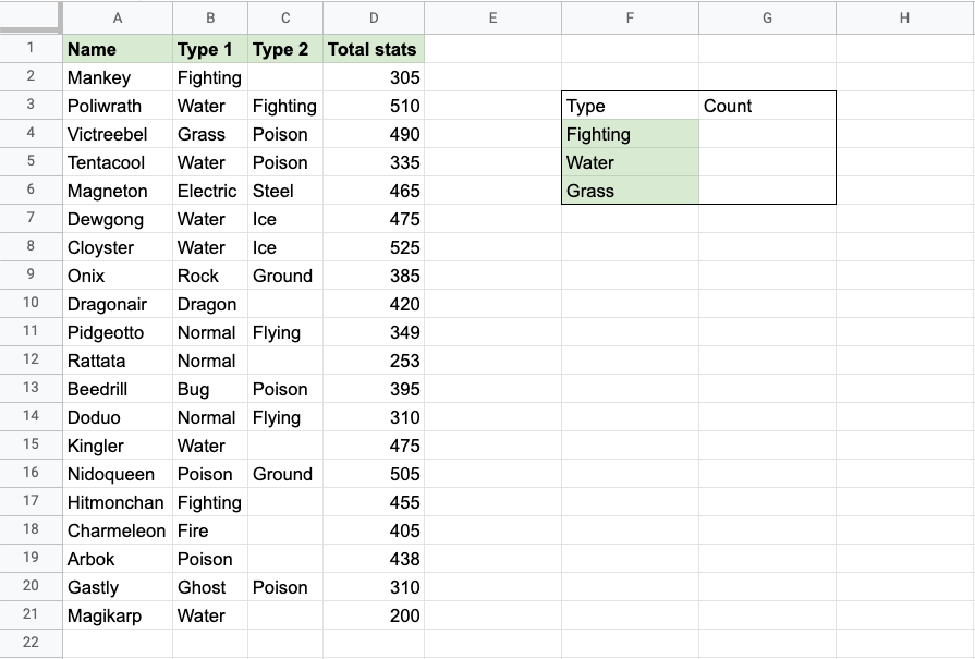 Apply the COUNTIF function to range B2:B21, to count how many Pokemons there are of Fighting, Water and Grass types: