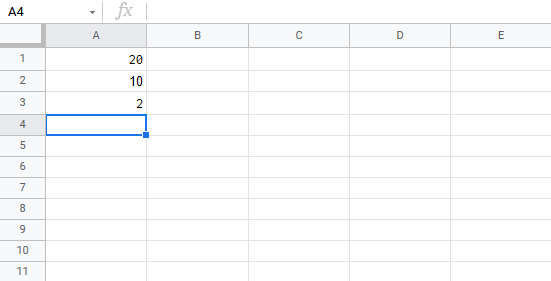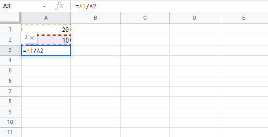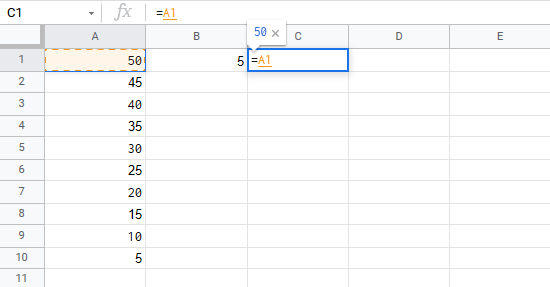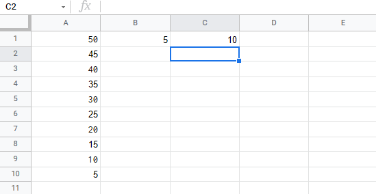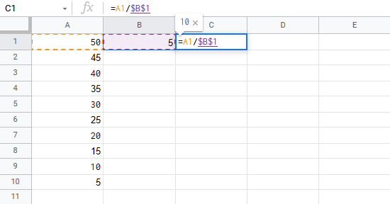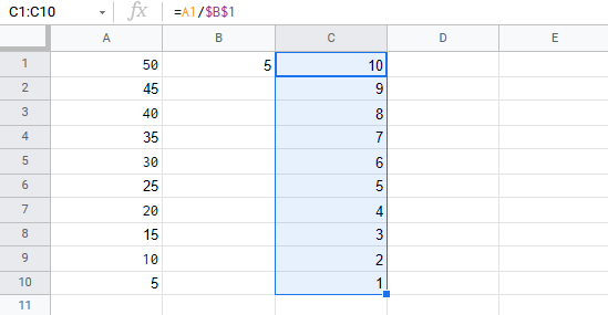 Let's have a look at an example where we divide B1(5) with the range A1:A10 using absolute reference and the fill function.