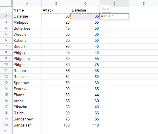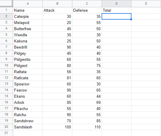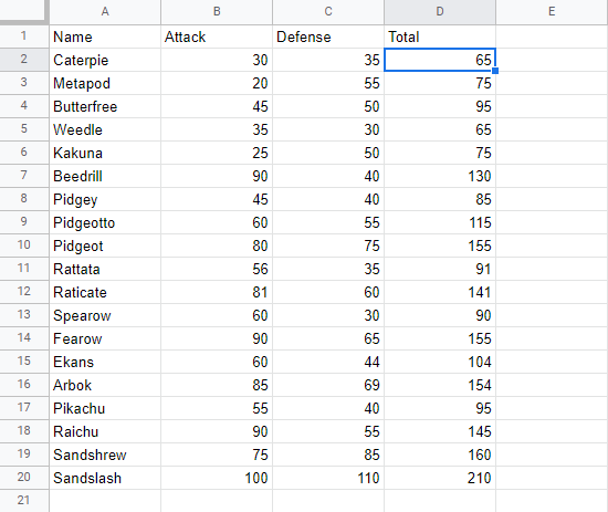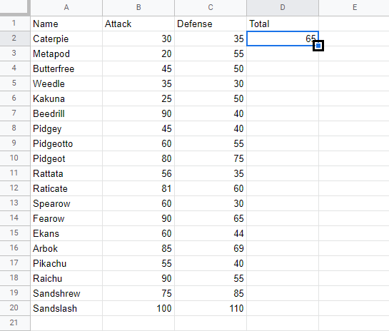 Let's use the Double click fill function to calculate the AttackB2:B20 + Defense C2:C20 for the Pokemons in the range D2:D20.