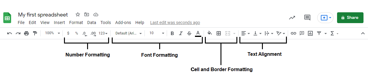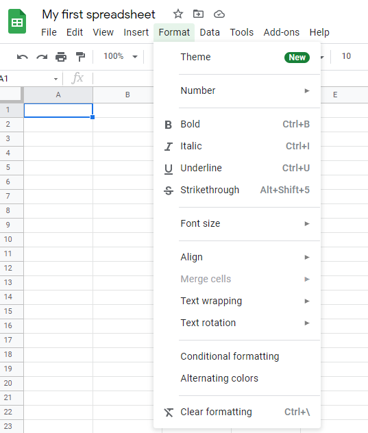 Read more about the Ribbon and the menu in the Google Sheets overview chapter.