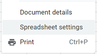 Changing Spreadsheet Location Settings is accessed in the Spreadsheet settings part of the File menu: