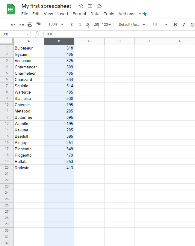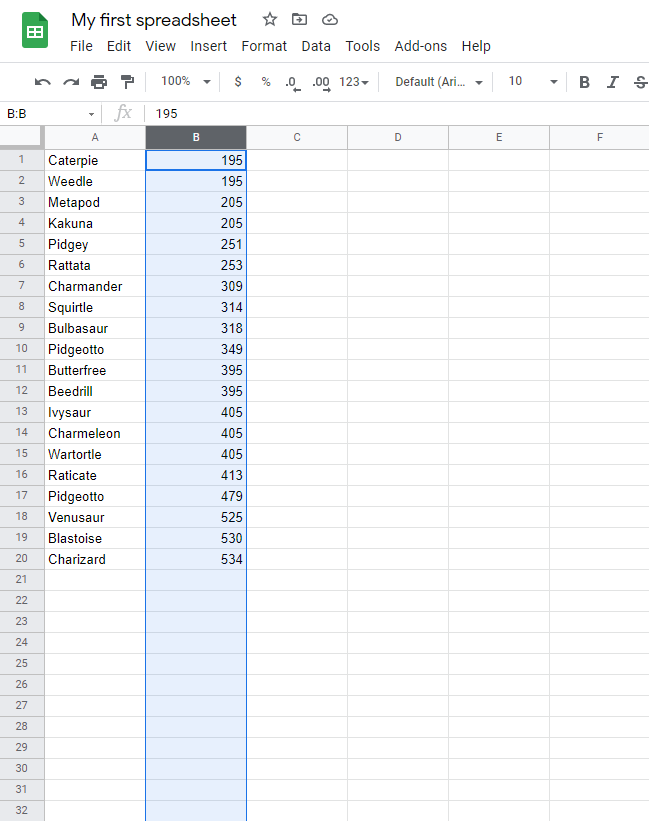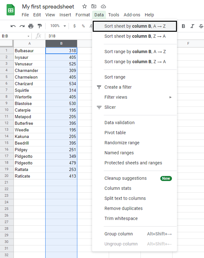- Click on the Data menu and select Sort sheet by column B, A → Z