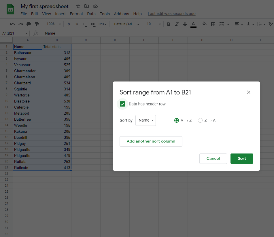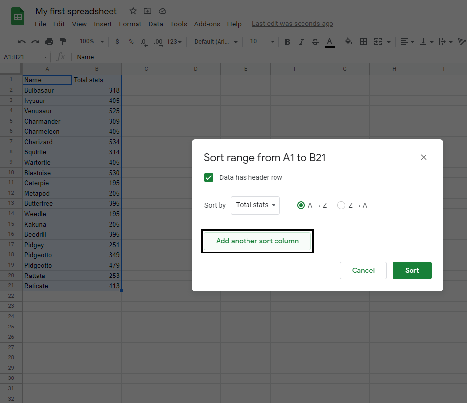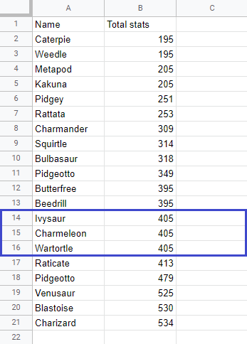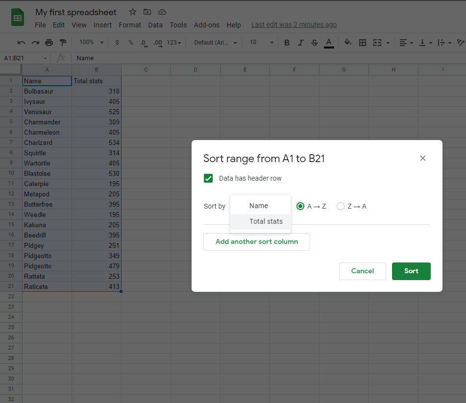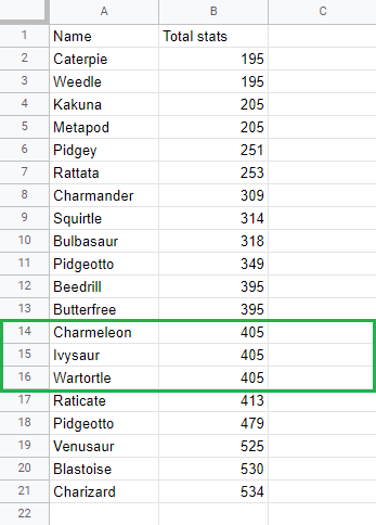 Sort the Pokemon in the range A2:A21 by their Total stats, ascending from smallest to largest (A-Z) and then sort the results based on their Name.