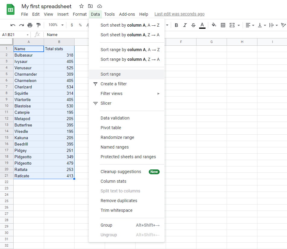 - Click on the Data menu and find Sort range