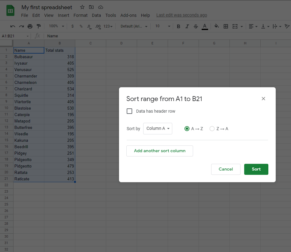 Sort the Pokemon in the range A2:A21 by their Total stats, ascending from smallest to largest (A-Z).