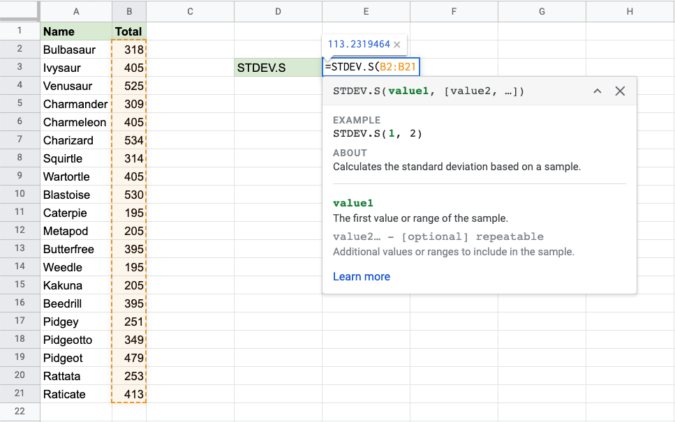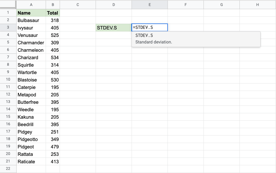 B2:B21for the Total stats for the sample Pokemon - Hit enter