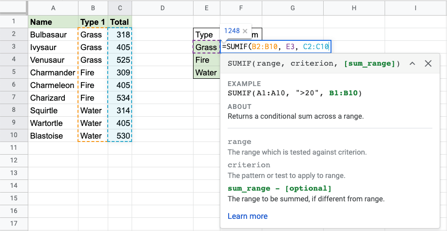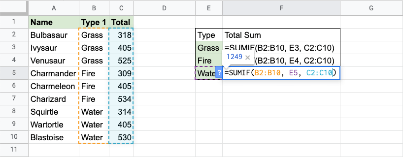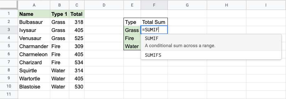 The SUMIF function is a premade function in Google Sheets, which calculates the sum of values in a range based on a true or false condition.
