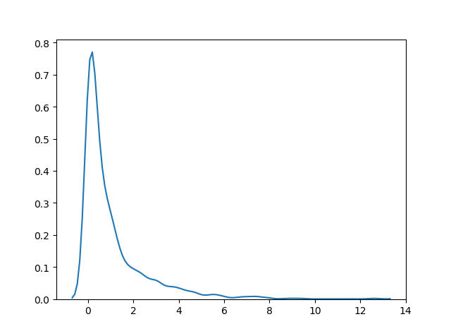 sns.distplot(random.chisquare(df=1, size=1000), hist=False)