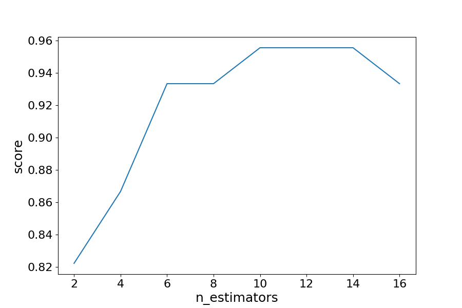 By iterating through different values for the number of estimators we can see an increase in model performance from 82.2% to 95.5%. After 14 estimators the accuracy begins to drop, again if you set a different random_state the values you see will vary.