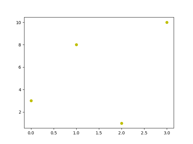 #Three lines to make our compiler able to draw: import sys import matplotlib matplotlib.use('Agg') import matplotlib.pyplot as plt import numpy as np ypoints = np.array([3, 8, 1, 10]) plt.plot(ypoints, 'oy') plt.show() #Two lines to make our compiler able to draw: plt.savefig(sys.stdout.buffer) sys.stdout.flush()
